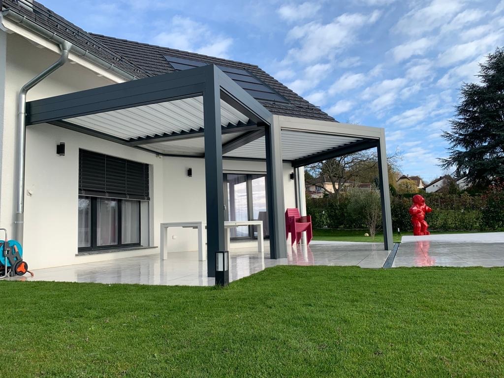 Pergola bioclimatique XXL à lames orientables et rétractables des deux côtés par moitié avec gestion de toiture indépendante